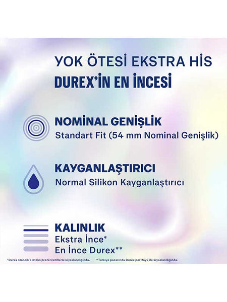 Durex Nude – Partnerinizin sıcaklığını daha yoğun hissettiren HEATSYNC teknolojisi. Paket içerisinde farklı isteklere hitap eden çeşitli özelliklerde 3 ayrı prezervatif çeşidi yer alır. Her biri sahip olduğu farklı özelliklerle o an duyulan isteğe göre tercih edilebilir. Paket içerisinde yer alan Yok Ötesi Ekstra His prezervatif çeşidi düz gövdeli, rezervuar uçlu ve pürüzsüz biçimlidir. 54 mm’lik nominal genişliğe sahiptir. Durex prezervatiflerinin arasında inceliğiyle öne çıkar. Klasik prezervatif çeşidi kolay takılır özellikte, rezervuar uçlu ve pürüzsüz biçime sahiptir. 56 mm nominal genişliğe sahiptir. Normal kalınlıktadır. Yakın Hisset kayganlaştırıcılı prezervatif çeşididir. Kalınlığı daha özel bir hissiyat için ince olacak şekilde tasarlanmıştır. Ekstra silikon kayganlaştırıcıya sahip ürün kuruluk yaşandığında bu hissin azaltılmasına yardımcı olması için tercih edilebilir. 56 mm’lik nominal genişliğe sahiptir.