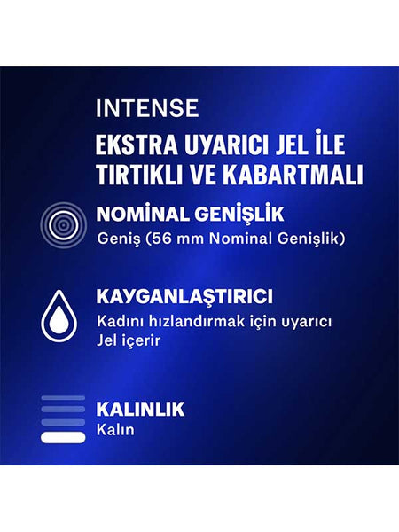 Latekse hassas olanlarınız da, ten tene temasın tüm zevkini doyasıya yaşayabilir. Bu prezervatifler, içerdikleri Desirex Jel ile ısıtıcı, soğutucu ve tahrik edici hisleri uyandırarak cinsel deneyiminizi daha yoğun hâle getirir. Kayganlaştırıcı prezervatif arayanların kullanabileceği kuruluk hissiyatını azaltan bir üründür. Tırtıklı dokusu sayesinde Durex Intense prezervatifler, kadınların daha fazla zevk almasına yardımcı olur ve cinsel deneyimi daha heyecanlı hale getirir. Tırtıklı ucunun yanında rezervuar uçlu ve kabartma noktalıdır. Durex Intense Prezervatifler, kadınların zevkin doruk noktasına daha kolay ve hızlı bir şekilde ulaşmasına yardımcı olur, böylece her iki taraf da daha fazla tatmin olabilir. Kabartmalı prezervatif seçeneklerinden biri olan Durex Intense Prezervatiflerin nominal genişliği 56 mm'dir. Hazzı daha rahat yaşaman için üretilen bu kayganlaştırıcılı prezervatif çeşidi normal kalınlığa sahiptir.