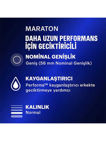 Durex Maraton, içeriğinde bulunan özel kayganlaştırıcı krem ile uzun süren performansı destekler. Bu sayede kayganlaştırıcılı prezervatif, cinsel deneyimini daha uzun ve keyifli hâle getirir. Geciktiricili prezervatif sınıfındaki bu ürünler %5 benzokain içeriği ile erkeğin cinsel deneyiminin uzun sürmesine yardımcı olur. Böylece daha fazla kontrol ve uzun süreli zevk elde edilebilir. İki tarafın da haz almasına yardımcı olur. Durex Maraton Prezervatifler, 56 mm nominal genişlikleri ile güvenli ve rahat bir kullanım sunar. Durex Maraton ile uzun süren performansın ve daha fazla zevkin tadını çıkarın.