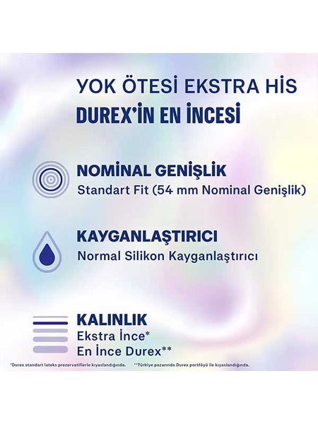 Durex Yok Ötesi Ekstra His Prezervatifler, daha fazla cilt teması ve hassasiyet sunmak için ekstra ince bir yapıya sahiptir. Bununla birlitke standart prezervatiflerin sahip olduğu koruma özelliği de yine onlarla aynıdır. Durex Yok Ötesi Prezervatif nominal genişliği 54 mm'dir. Bu ölçü, mükemmel bir uyum ve güvenlik sağlar. Durex Yok Ötesi Prezervatif pürüzsüz yüzeye sahiptir ve bu sayede hassasiyeti maksimum düzeye çıkarır.